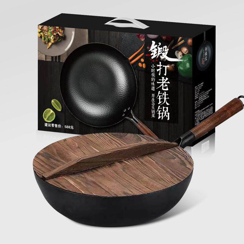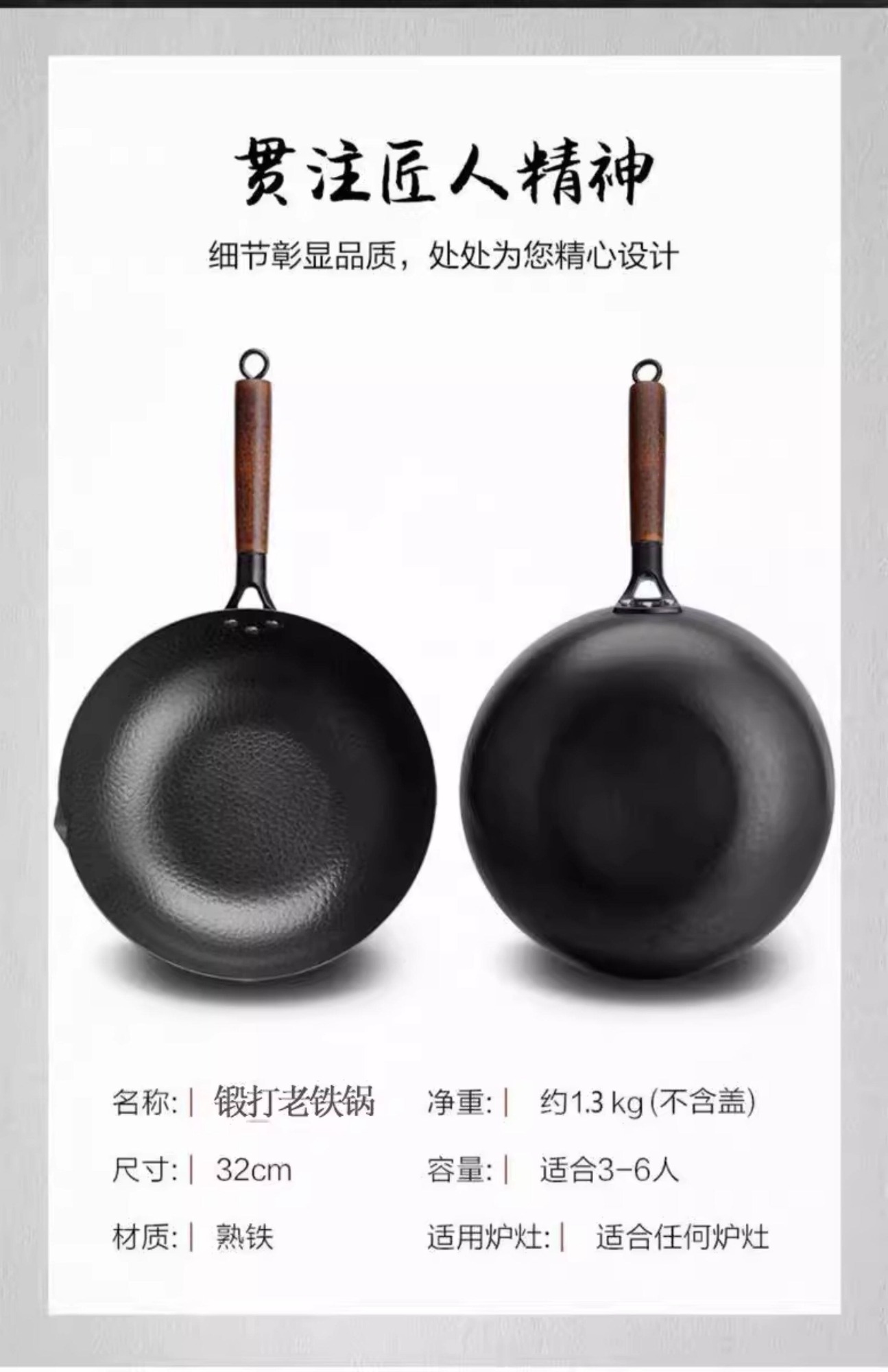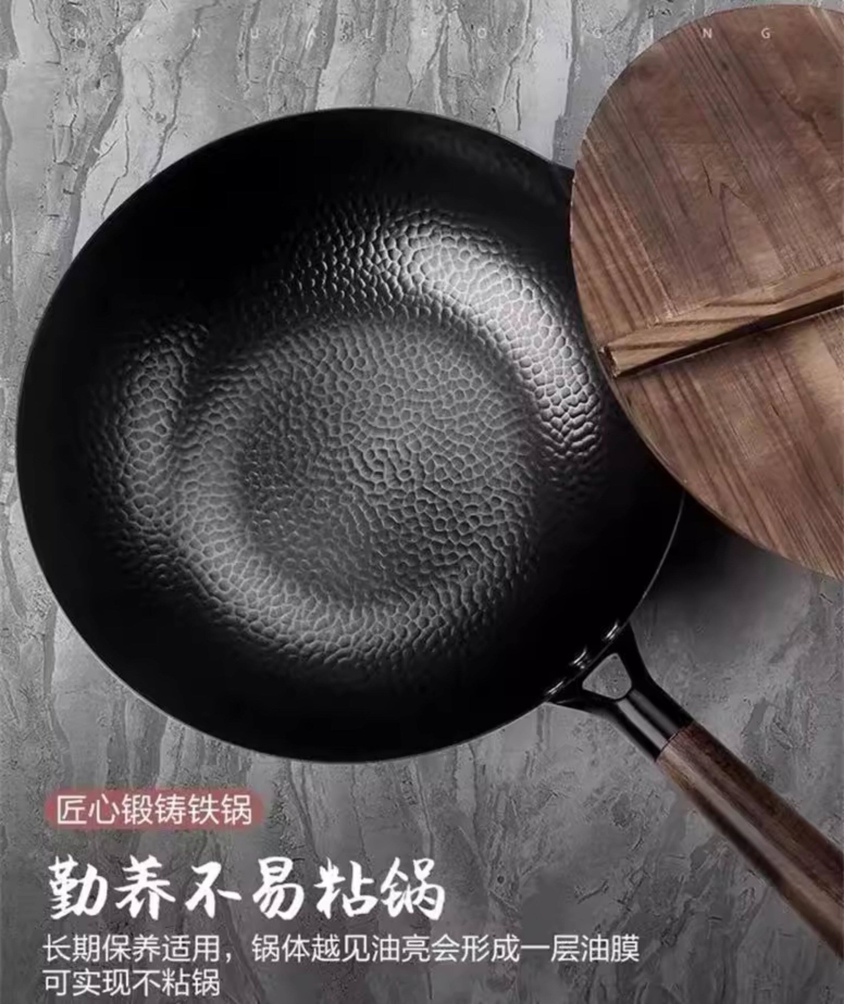 章丘手工锻打锤纹老铁锅(32cm, 带木盖)